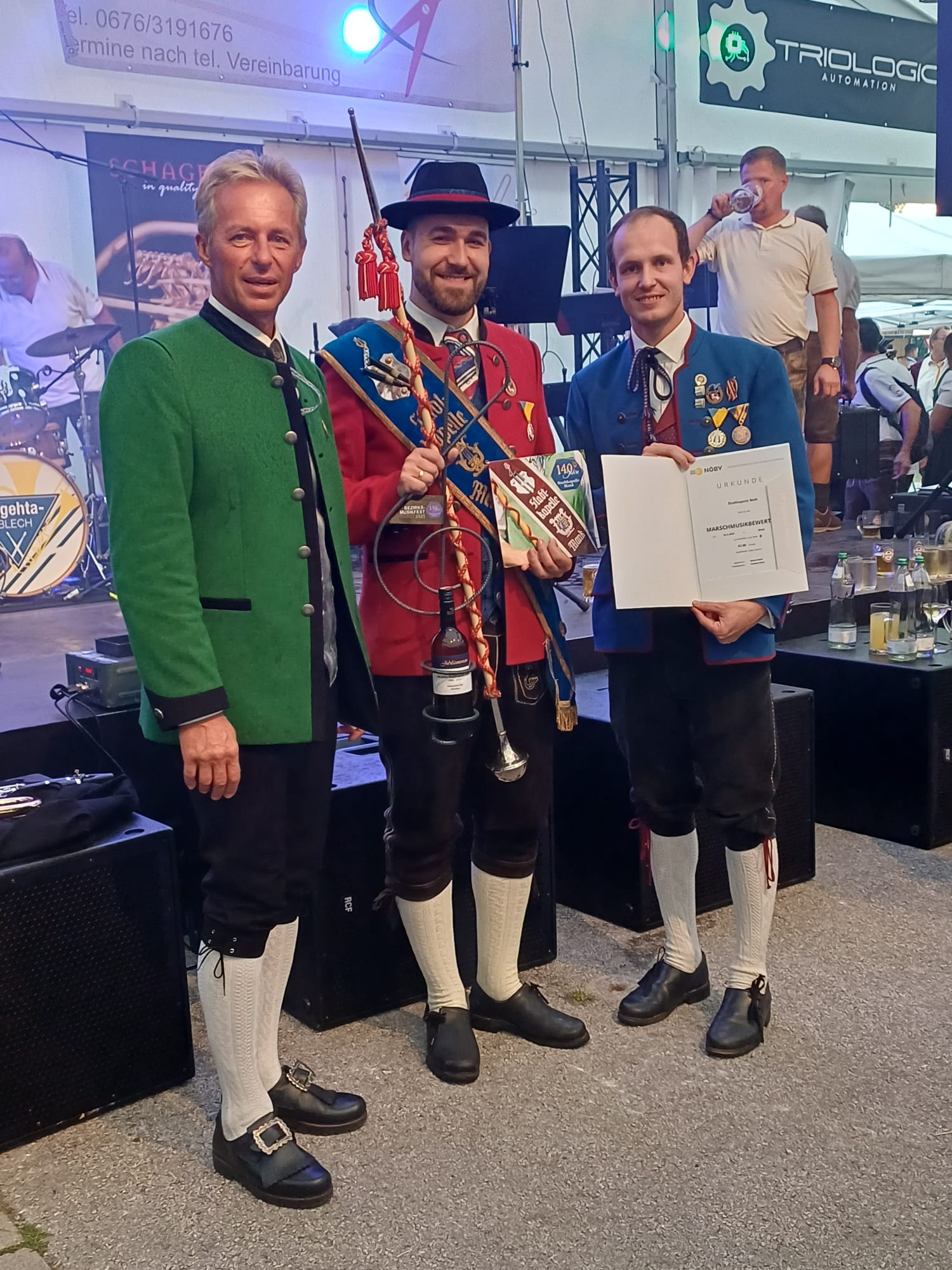 Alois Riedler wurde ein großes Dankeschön ausgesprochen für unzählige Arbeitsstunden beim Erstellen der neuen wasserfesten Marschbücher. Als Dank und Anerkennung bekam Alois neben einem Gruppenbild, das „goldene Marschbuch“ überreicht!